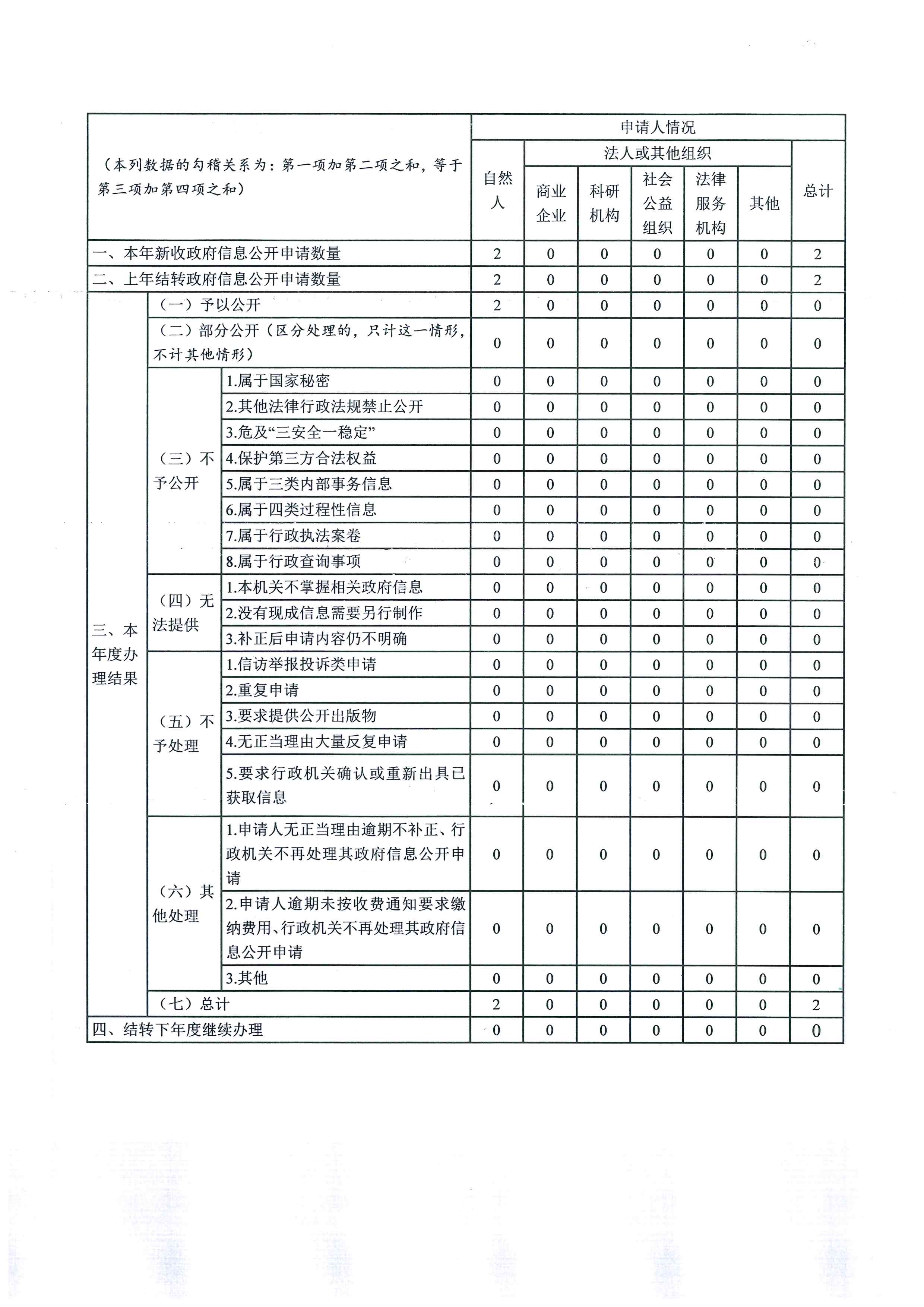 2021年我局共受理政府信息公开申请2件,办结率100%。受理方式包括信函申请1件、网络申请1件,其中:予以公开数2件。