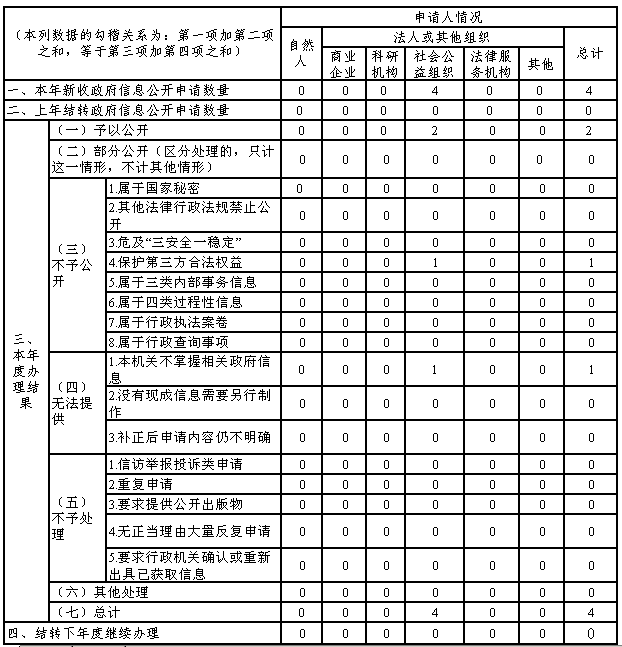 (二)依申请公开情况。2020年,收到政府信息公开申请4次,其中属我局掌握政府信息2项,已按时答复办结;另1项“涉及商业秘密、个人隐私等公开会对第三方合法权益造成损害的政府信息,行政机关不得公开”,我局不予公开;另1项“非政府信息”,及时告知申请人向相关单位申请。因政府信息公开被申请行政复议2件,上级部门裁定结果维持。因政府信息被提起行政诉讼2件,尚未审结。