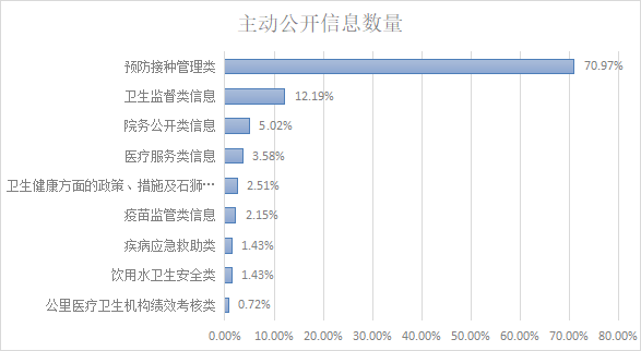 2022年度,重点对卫生健康方面信息进行公开,其中卫生健康方面的政策、措施及其实施情况类信息7条,占2.51%;院务公开类信息14条,占5.02%;卫生监督类信息34条,占12.19%;医疗服务类信息10条,占3.58%;预防接种管理类信息198条,占70.97%;疾病应急救助类信息4条,占1.43%;饮用水卫生安全类信息4条,占1.43%;疫苗监管类信息6条,占2.15%;公立医疗卫生机构绩效考核类信息2条,占0.72%。积极通过米乐体育 门户网站、“米乐体育 卫生健康局”微信公众号、《石狮日报》、政务公开栏等方式及时解读卫生健康工作相关政策,在米乐体育 门户网站解读《关于适用<医师法>和<医疗机构管理条例>行政处罚自由裁量权基准(试行)》。