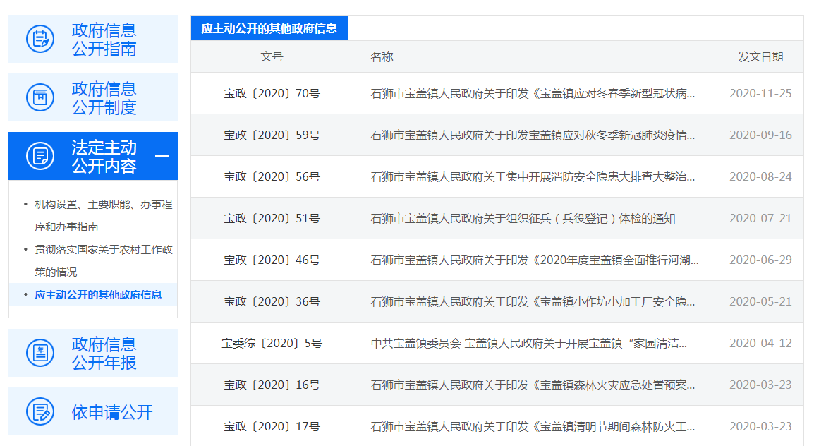 (三)规范公开平台建设。按照《国务院办公厅关于全面推进基层政务公开标准化规范化工作的指导意见》(国办发〔2019〕54号)、《福建省人民政府办公厅关于全面推进基层政务公开标准化规范化工作的通知》(闽政办〔2020〕26号)、《米乐体育 办公室关于印发米乐体育 全面推进基层政务公开标准化规范化工作方案的通知》(狮政办〔2020〕22号)等文件精神,2020年9月11日印发《宝盖镇全面推进基层政务公开标准化规范化工作方案》,并组建工作专班,加强督促协调。结合镇权责清单以及市级26个试点领域标准目录,按照公开事项、公开内容、公开依据、公开时限、公开主体、公开渠道和载体、公开对象、公开方式、公开层级等要素,11月14日梳理完成《宝盖镇人民政府政务公开事项标准目录》,涉及19个领域,共梳理一级事项51项、二级事项129项,并按要求在政府网站公布,进行动态管理更新。2020年,公开机构设置、主要职能、办事程序、办事指南类信息10条,贯彻落实国家关于农村工作政策的情况类信息13条,应主动公开的其他政府信息10条;共收到政府信息公开申请0件(历年累计数量0件),其中:当面申请0件,以网上提交表单形式申请0件,其他形式申请0件。