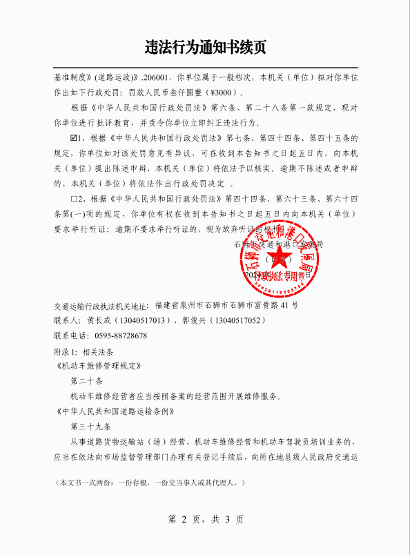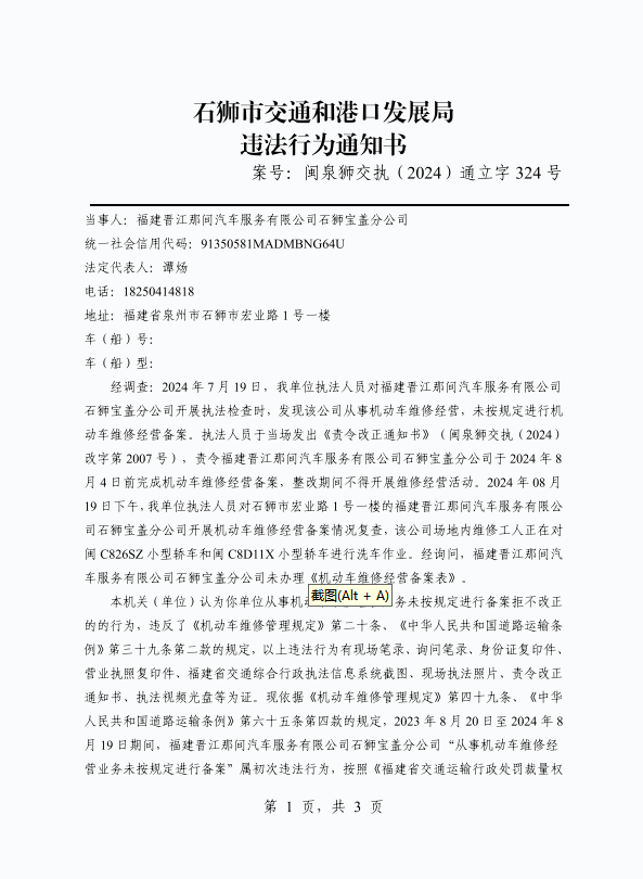 交通和港口发展局违法行为通知书》(闽泉狮交执〔2024〕通立字324号)