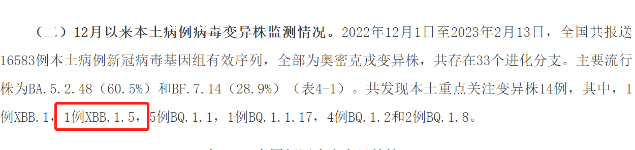 据了解,该话题词的出现的起因,是中国疾控中心2月15日发布的《全国新型冠状病毒感染疫情情况》。据通报,2022年12月以来,全国共发现本土重点关注变异株14例,其中1例XBB.1.5,为本周期新增变异株病例。