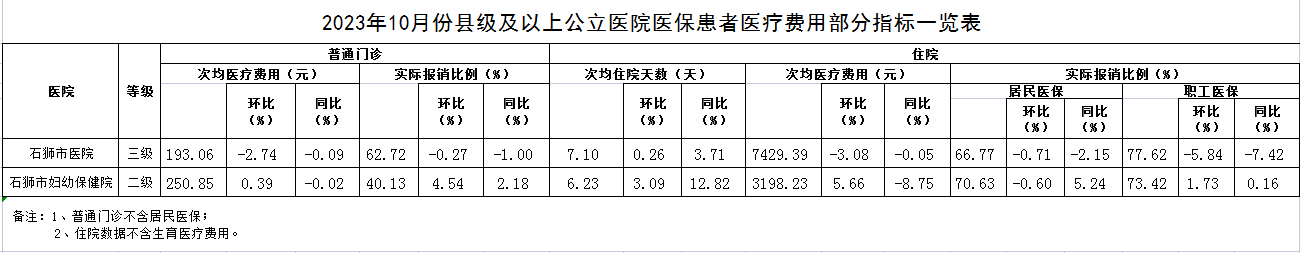 2023年10月份县级及以上公立医院医保患者医疗费用部分指标一览表