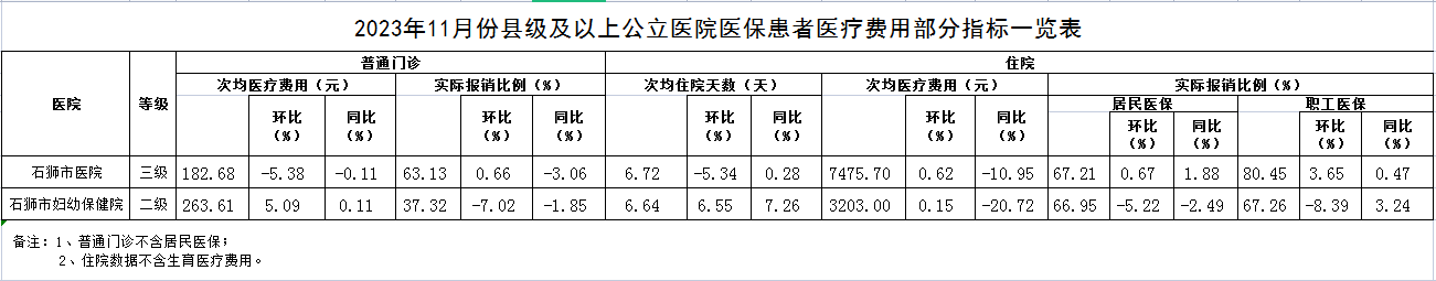 2023年11月份县级及以上公立医院医保患者医疗费用部分指标一览表