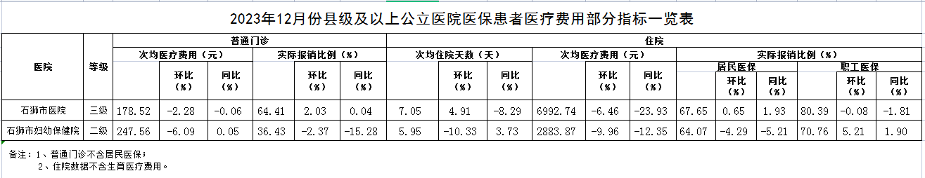 2023年12月份县级及以上公立医院医保患者医疗费用部分指标一览表