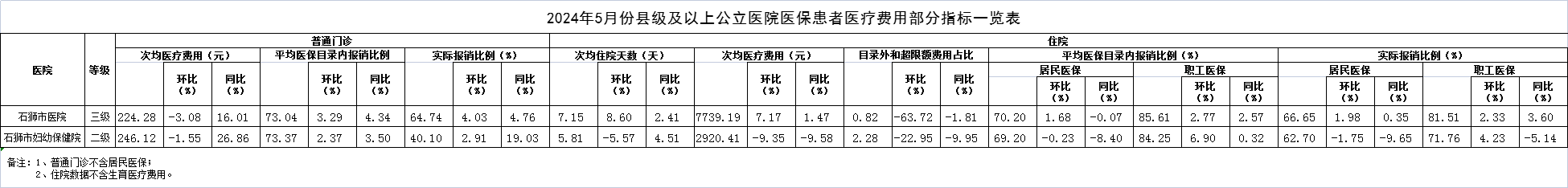 2024年5月份县级以上公立医院医保患者医疗费用部分指标一览表