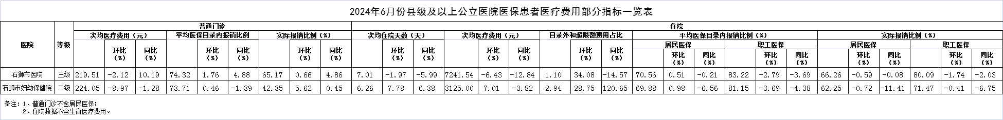 2024年6月份县级以上公立医院医保患者医疗费用部分指标一览表