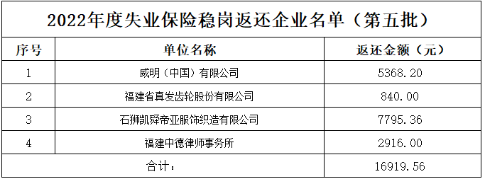 根据《福建省人力资源和社会保障厅关于进一步做好失业保险稳岗返还工作的通知》(闽人社文〔2023〕102号)和《福建省人力资源和社会保障厅关于明确失业保险相关政策实施意见的通知》文件精神,市人社局对省级下发初步符合政策条件企业名单进行审核,并征求相关部门意见,现拟向威明(中国)有限公司等4家单位拨付稳岗返还资金。为保证发放程序公开公正,保障失业保险基金安全,现面向社会公示(公示名单详见附件),接受社会监督。