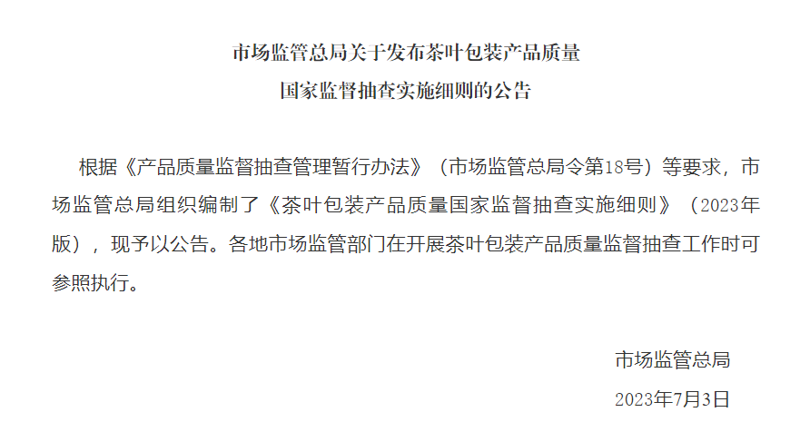 近日,市场监管总局发布《茶叶包装产品质量国家监督抽查实施细则》。